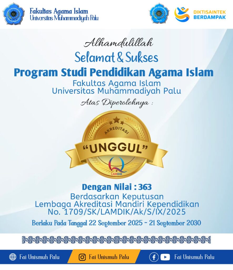 SULTENG RAYA– Program Studi Pendidikan Agama Islam (PAI) Fakultas Agama Islam (FAI) Universitas Muhammadiyah (Unismuh) Palu berhasil meraih akreditasi “Unggul” dari Lembaga Akreditasi Mandiri Kependidikan (Lamdik) berdasarkan SK Nomor: 1079/SK/LAMDIK/Ak/S/IX/2025. Status akreditasi ini berlaku sejak 22 September 2025 hingga 21 September 2030.