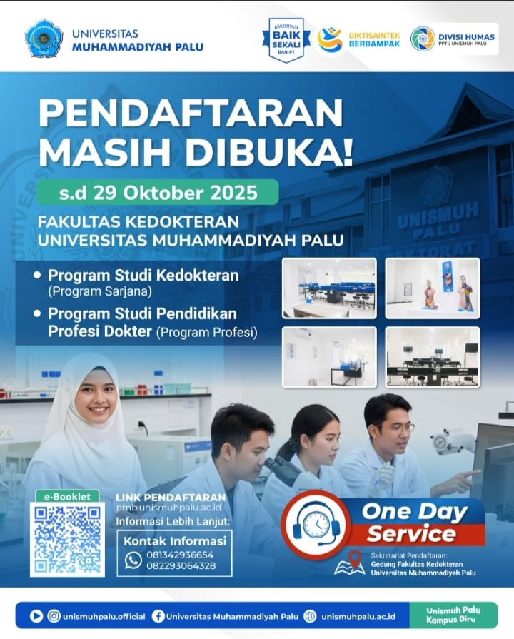 SULTENG RAYA- Fakultas Kedokteran (FK) Universitas Muhammadiyah (Unismuh) Palu memperpanjang masa penerimaan mahasiswa baru (PMB) hingga 29 Oktober 2025. Keputusan ini diambil guna memberikan kesempatan lebih luas kepada putra-putri terbaik bangsa, khususnya dari Sulawesi Tengah dan kawasan sekitarnya, untuk menempuh pendidikan kedokteran di kampus tersebut.