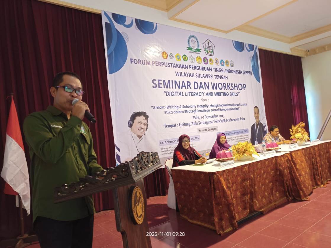 SULTENG RAYA– Forum Perpustakaan Perguruan Tinggi Indonesia (FPPTI) Sulteng bersama Politeknik Cendrawasih Palu menggelar Seminar dan workshop digital literacy and writing skills, selama dua hari, 1-2 November 2025 dipusatkan di Aula Politeknik Cendrawasih Palu.