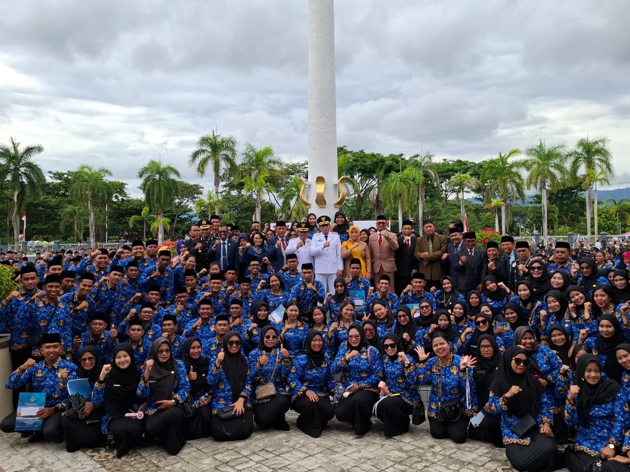 SULTENG RAYA – Sebanyak 941 Pegawai Pemerintah dengan Perjanjian Kerja (PPPK) Kabupaten Parigi Moutong formasi tahun 2024 tahap II resmi menerima Surat Keputusan (SK) Bupati. Bupati Parmout, Erwin Burase menyerahkan SK secara simbolis kepada 10 perwakilan PPPK yang dilanjutkan dengan acara pengukuhan bertepatan dengan upacara peringatan Hari Pahlawan di halaman Kantor Bupati Parigi Moutong, Senin (10/11/2025).