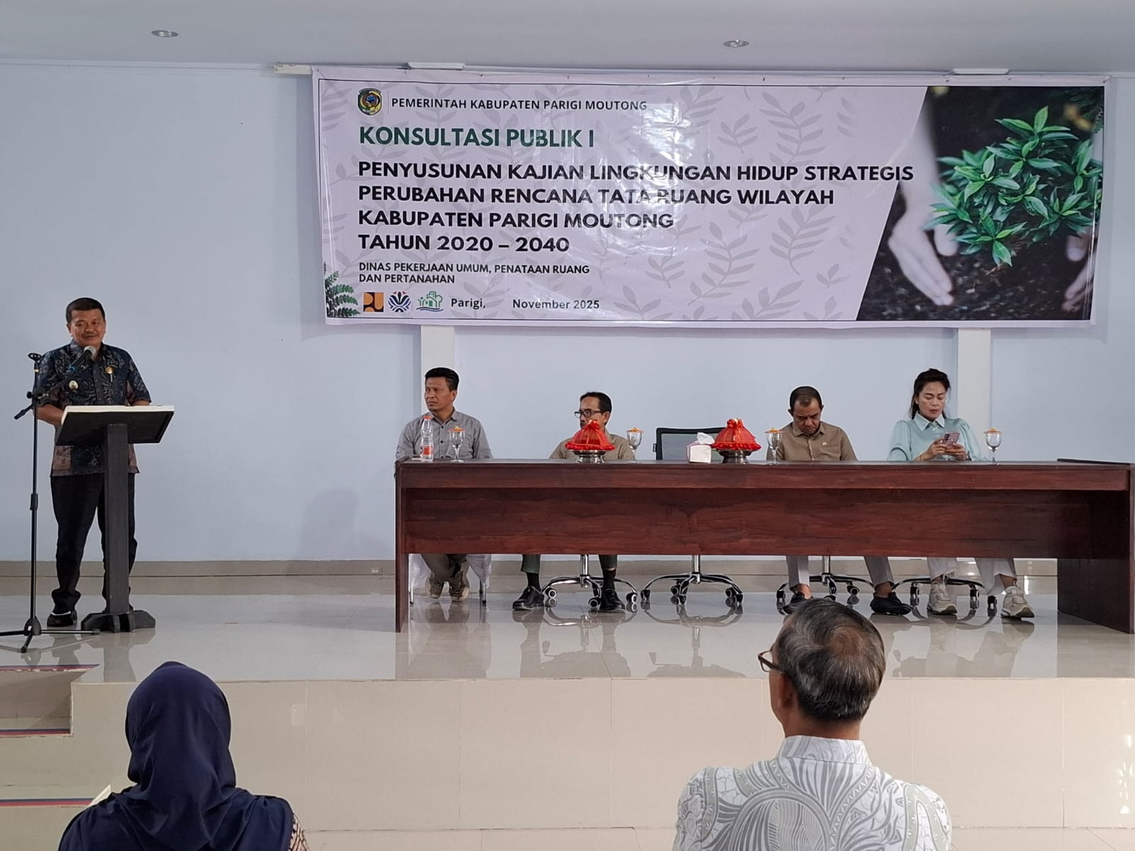 SULTENG RAYA – Pemerintah Daerah (Pemda) Kabupaten Parigi Moutong menggelar Konsultasi Publik 1 Penyusunan Dokumen Kajian Lingkungan Hidup Strategis (KLHS) Perubahan Rencana Tata Ruang Wilayah (RTRW) tahun 2020-2040 di salah satu hotel di Parigi, Kamis (13/11/2025).
