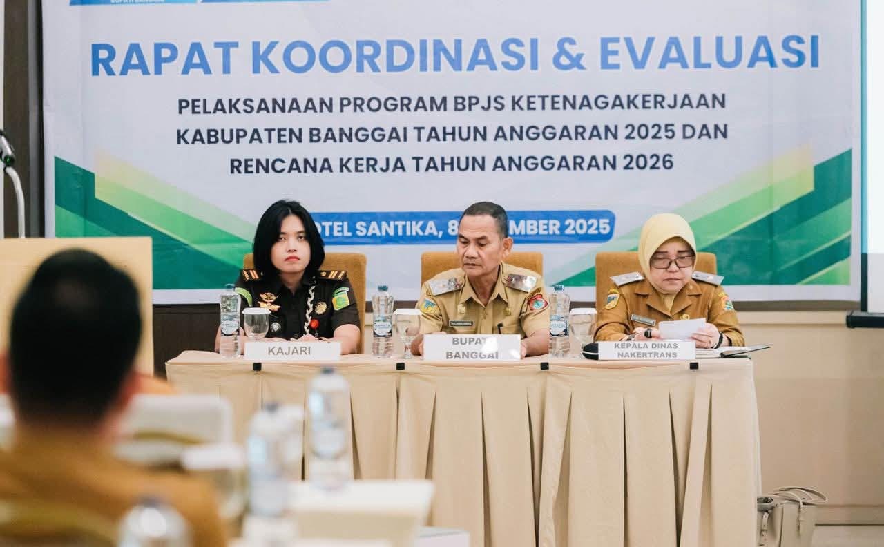 SULTENG RAYA – Staf Ahli Bupati Banggai Bidang Ekonomi, Keuangan dan Pengembangan Wilayah, Amin Jumail, membuka Rapat Koordinasi (Rakor) dan evaluasi pelaksanaan program BPJS Ketenagakerjaan tahun anggaran 2025 dan Rencana Kerja (Renja) tahun anggaran 2026, yang diselenggarakan oleh Dinas Tenaga Kerja dan Transmigrasi (Disnakertrans), di salah satu hotel di Luwuk, Senin (8/12/2025).