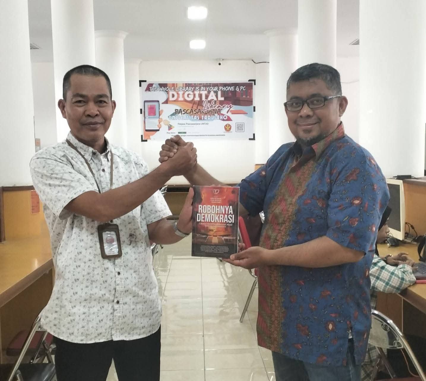 SULTENG RAYA- Dosen Universitas Muhammadiyah (Unismuh) Palu, Dr. Fery, S.Sos., M.Si menyerahkan buku berjudul “Robohnya Demokrasi: Catatan Kritis Seperempat Abad Reformasi Indonesia”, kepada Ketua Forum Perpustakaan Perguruan Tinggi Indonesia (FPPTI) Provinsi Sulawesi Tengah, Dr. H. Saharuddin Lurang, S.Sos, M.Si, Rabu (17/12/2025).