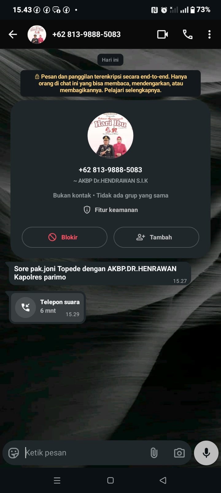 SULTENG RAYA – Kepolisian Resor Polres Parigi Moutong mengimbau seluruh masyarakat untuk meningkatkan kewaspadaan terhadap maraknya modus penipuan yang mengatasnamakan pejabat kepolisian, khususnya mengaku sebagai Kasat Reskrim Polres Parigi Moutong, bahkan hingga mengatasnamakan Kapolres Parigi Moutong.