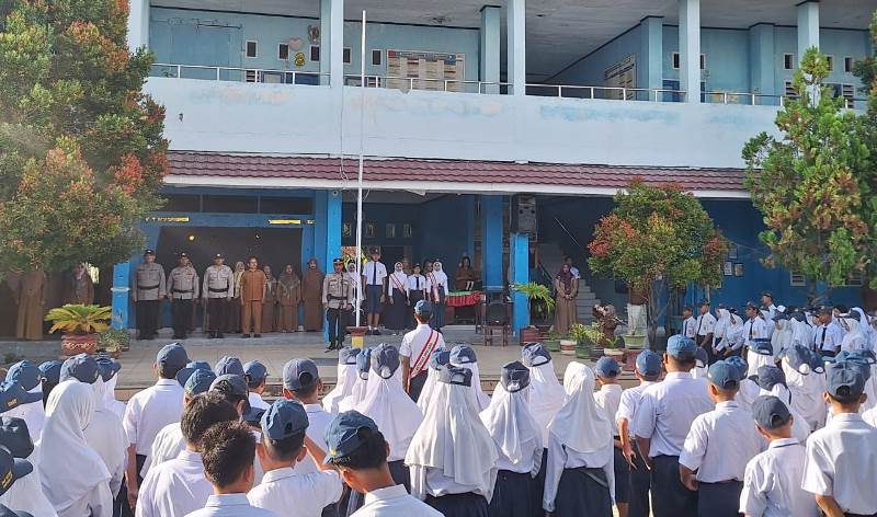 Didampingi jajaran personel Binmas lainnya, Agus menyampaikan pesan-pesan penting dihadapan Kepala Sekolah, Nisma, S.Pd, M.Pd, para dewan guru, serta seluruh siswa-siswi yang memadati lapangan sekolah tersebut.