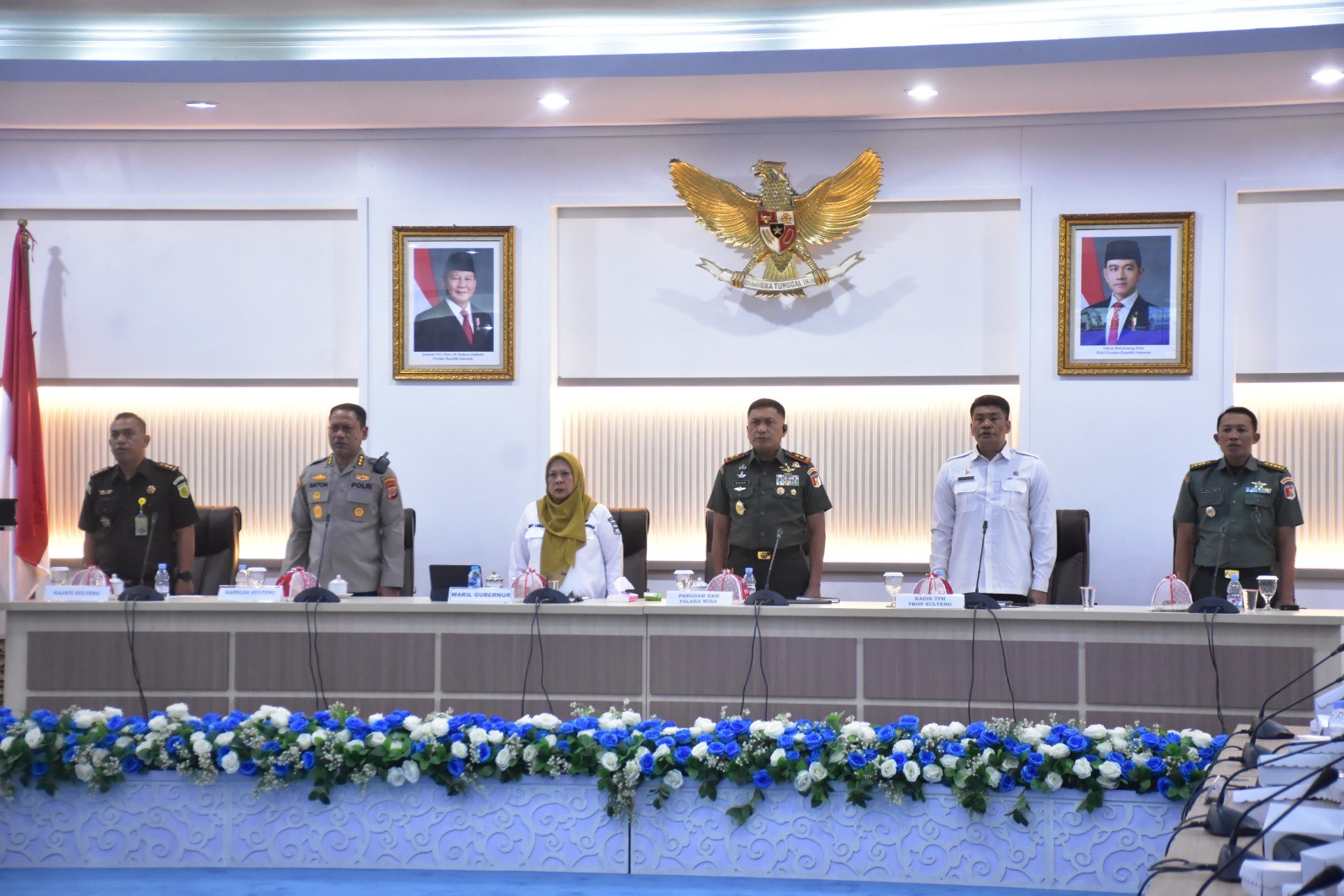 SULTENG RAYA – Panglima Kodam (Pangdam) XXIII/Palaka Wira (PW) bersama unsur Forkopimda Provinsi Sulawesi Tengah (Sulteng), mengikuti Panen Raya Nasional dan pengumuman swasembada pangan oleh Presiden Republik Indonesia, yang dilaksanakan secara vicon dari ruang Polibu kantor Gubernur Sulteng, Rabu (7/1/2026).