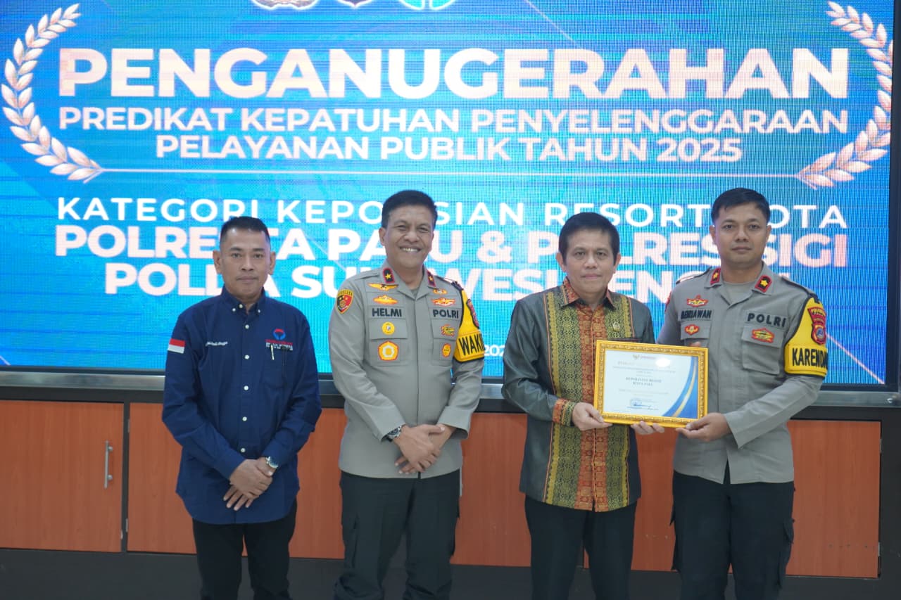 SULTENG RAYA – Polresta Palu meraih Penghargaan Predikat Kepatuhan Penyelenggaraan Pelayanan Publik Tahun 2025 yang diberikan oleh Ombudsman Republik Indonesia. Penghargaan tersebut diterima oleh Kabagops Polresta Palu Kompol I Dewa Gede Meiriawan, mewakili Kapolresta Palu Kombes Pol Hari Rosena.
