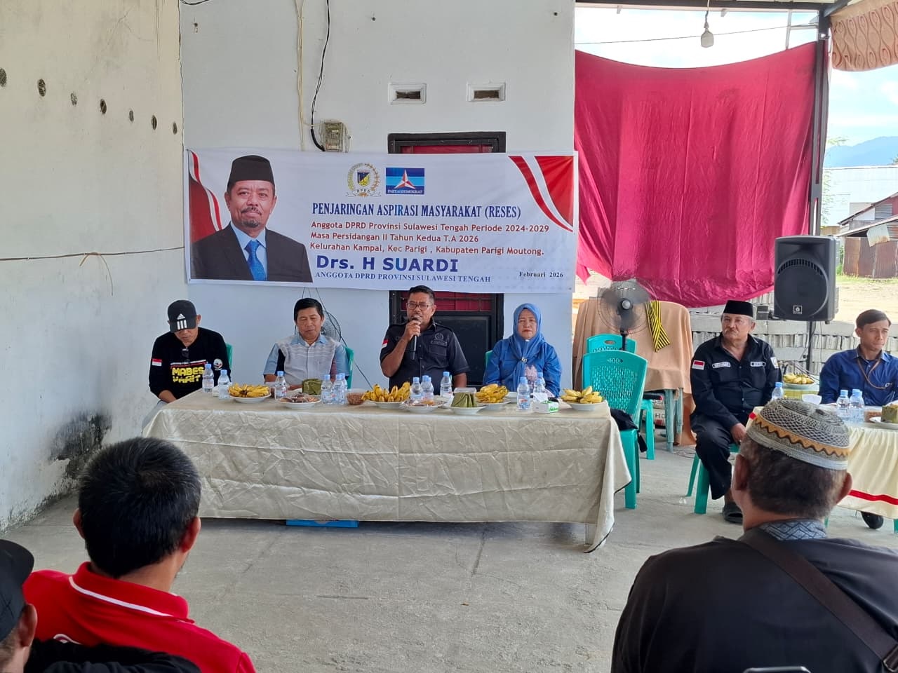 Anggota DPRD Provinsi Sulawesi Tengah dari Daerah Pemilihan Parigi Moutong, Drs. H. Suardi, menyapa warga dalam rangkaian reses 11–14 Februari 2026 yang digelar di empat titik: Desa Tolai Timur Kecamatan Torue, Desa Beraban Kecamatan Balinggi, Kelurahan Kampal Kecamatan Parigi, dan Desa Toboli Kecamatan Parigi Utara.