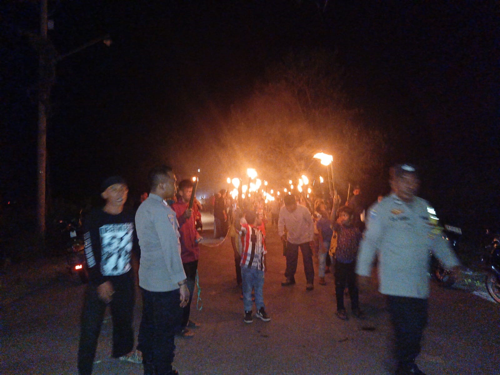 Ratusan warga dan mahasiswa turun ke jalan mengikuti pawai obor yang berlangsung khidmat sekaligus meriah, menerangi malam dengan cahaya obor dan semangat kebersamaan.