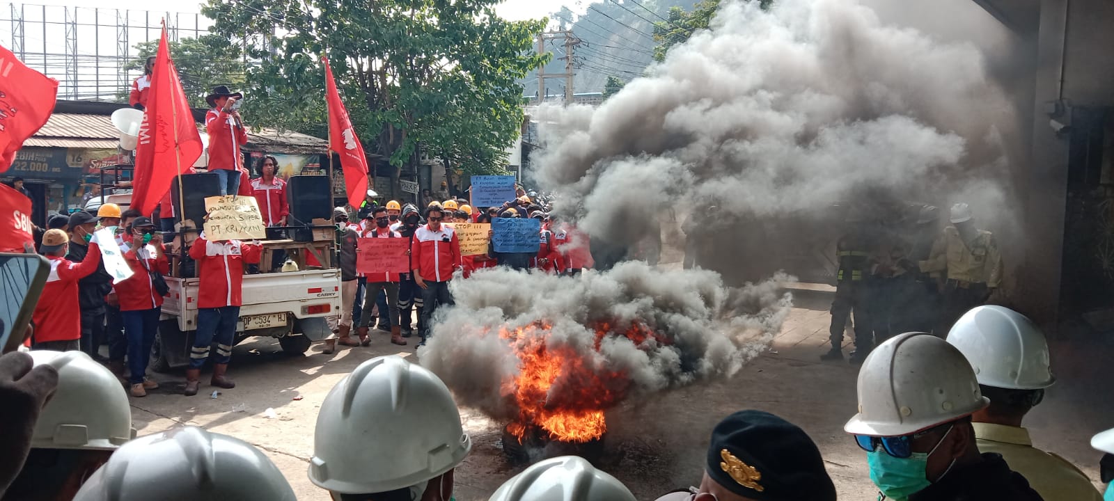 SULTENG RAYA — Aksi unjuk rasa yang dilakukan Serikat Buruh Industri Morowali Indonesia (SBIMI) di depan kantor PT Indonesia Morowali Industrial Park (IMIP), Rabu (18/2/2026), berujung insiden hingga menyebabkan dua petugas keamanan mengalami luka bakar.