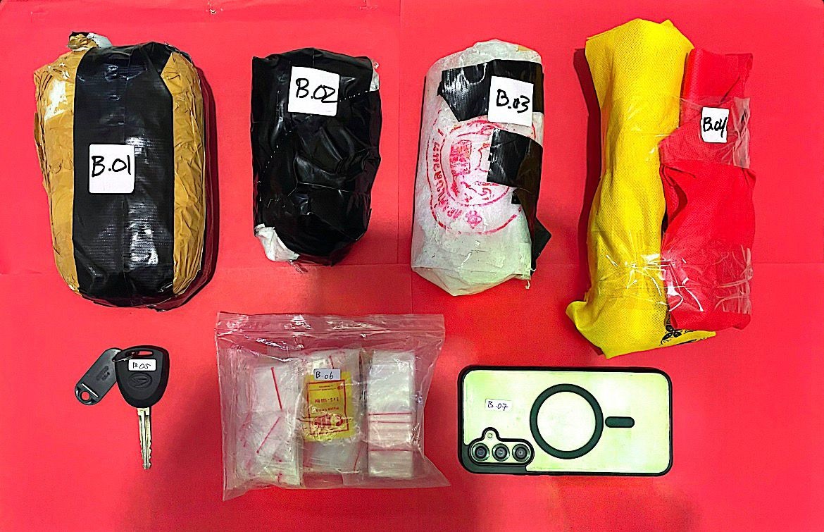 Dari hasil penggeledahan badan, rumah, dan kendaraan, petugas menemukan 3 paket besar diduga sabu dengan berat bruto 2,085 kilogram, 1 unit HP Samsung A54, dan 1 unit mobil Ayla merah DN 1153 FV.