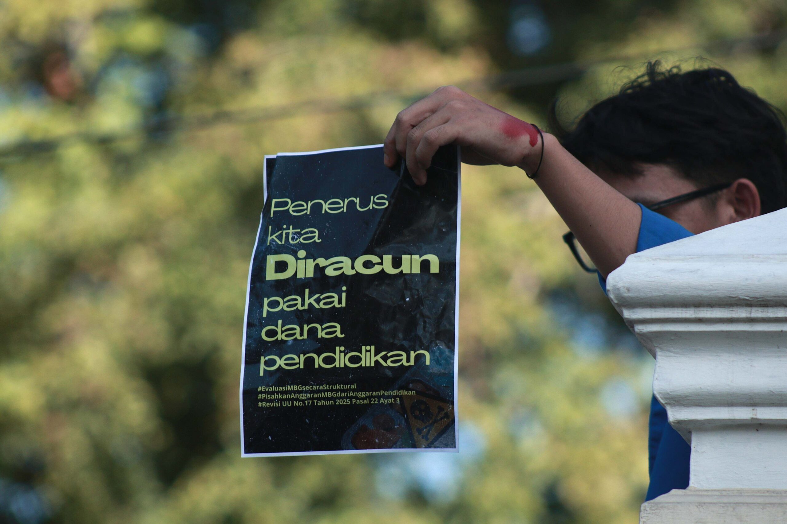Koordinator Lapangan Aliansi Cipayung, Ahmad Al Habsi dalam orasinya menyampaikan, program andalan rezim Prabowo-Gibran yakni MBG dinilai cacat secara hukum baik secara materil maupun formil, karena sesuai amanat Undang Undang mewajibkan negara memprioritaskan anggaran pendidikan sekurang-kurangnya 20 persen dari APBN dan APBD, yang bertujuan menjamin pemenuhan penyelenggaraan pendidikan nasional yang berkualitas, adil, dan merata, mencakup belanja operasional dan pengembangan, namun pada faktanya anggaran pendidikan harus dipotong untuk program MBG.